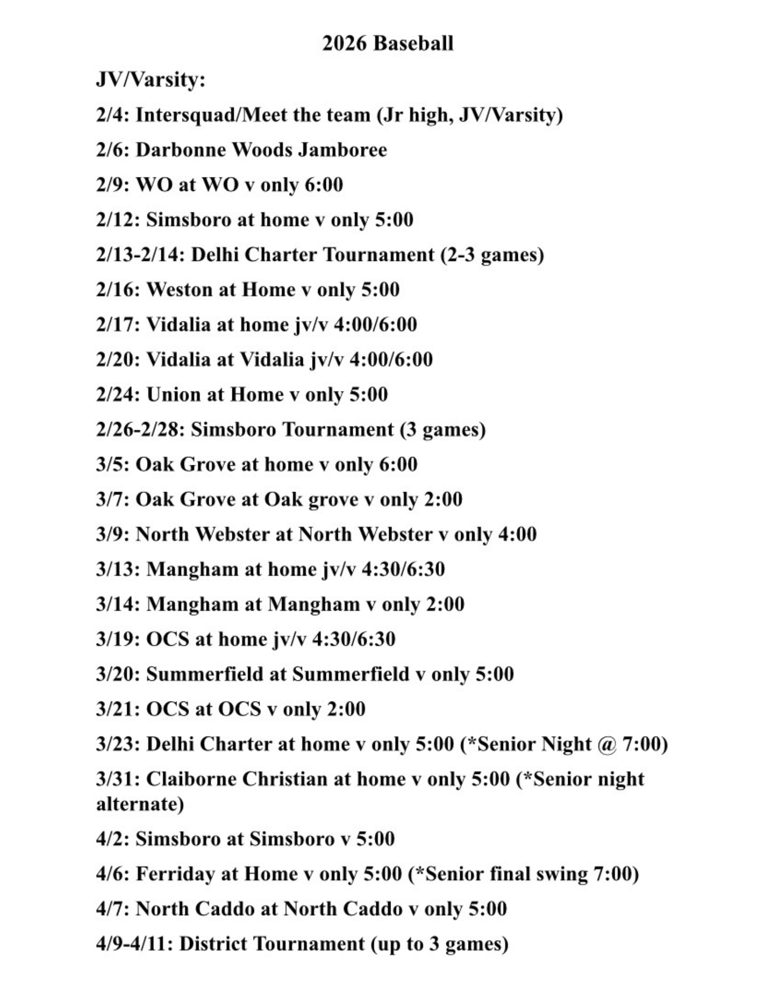 JV/Varsity Schedule: